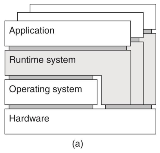 회색으로 되어있는 부분이 가상화 레이어이다. 원래 이 플랫폼에서 돌아가는 host OS가 있고 그 호스트 os 위에서 가상화 레이어가 덧씌워지는 형태이다. Runtime system 또한 기존 OS 위에서 돌아가는 일종의 애플리케이션이고 다른 OS의 동작을 흉내 내는 애플리케이션이다.