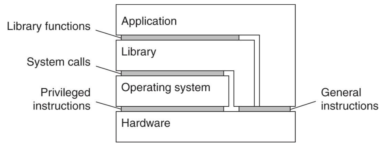 하드웨어의 리소스를 사용하는 애플리케이션을 만들려면 OS 단에서 제공해주는 시스템 콜 함수를 사용하여 만들어야한다. 시스템콜 함수는 라이브러리 형태로 제공된다. 아래 그림에서 회색으로 표시된 부분이 인터페이스이다. 인터페이스도 레벨이 있다.