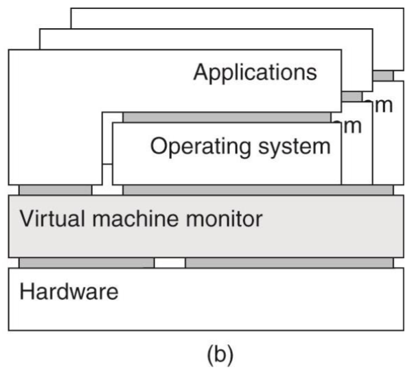 VMM이라는 가상머신 레이어가 하드웨어 전체를 shielding 한다. 하드웨어 리소스를 직접 사용해서 하드웨어와 OS/어플리케이션 레이어 사이에 위치한다. 하드웨어를 직접 제어하고 VMM 위에 OS나 애플리케이션을 실행시킬 수 있다.