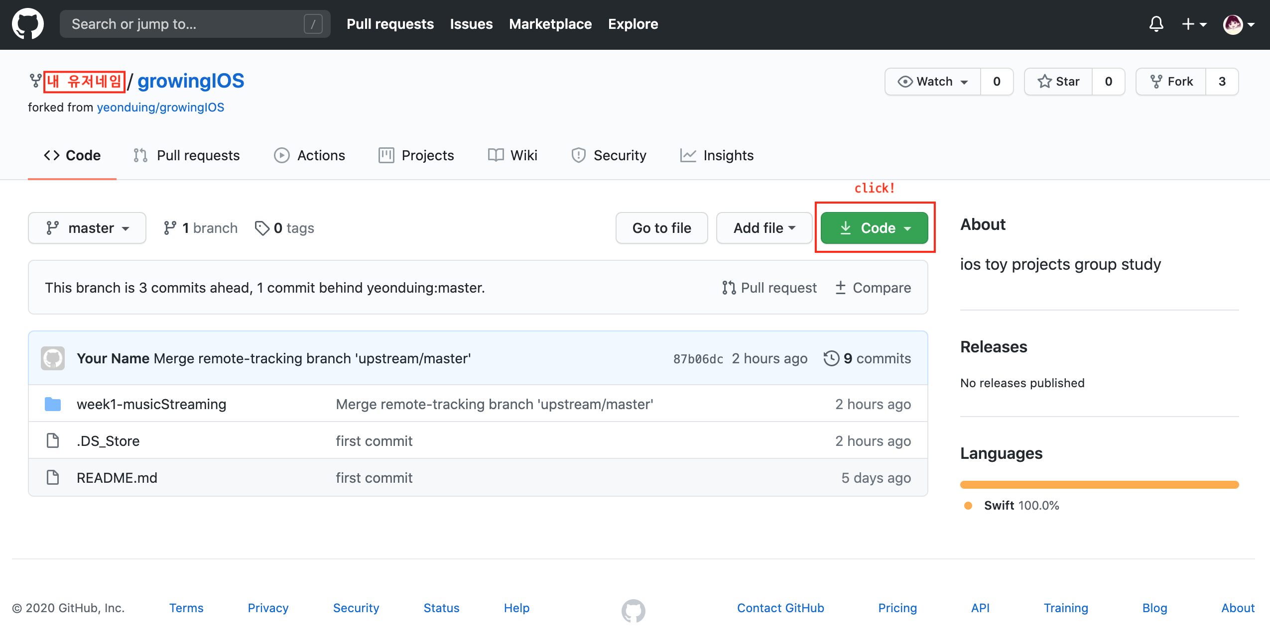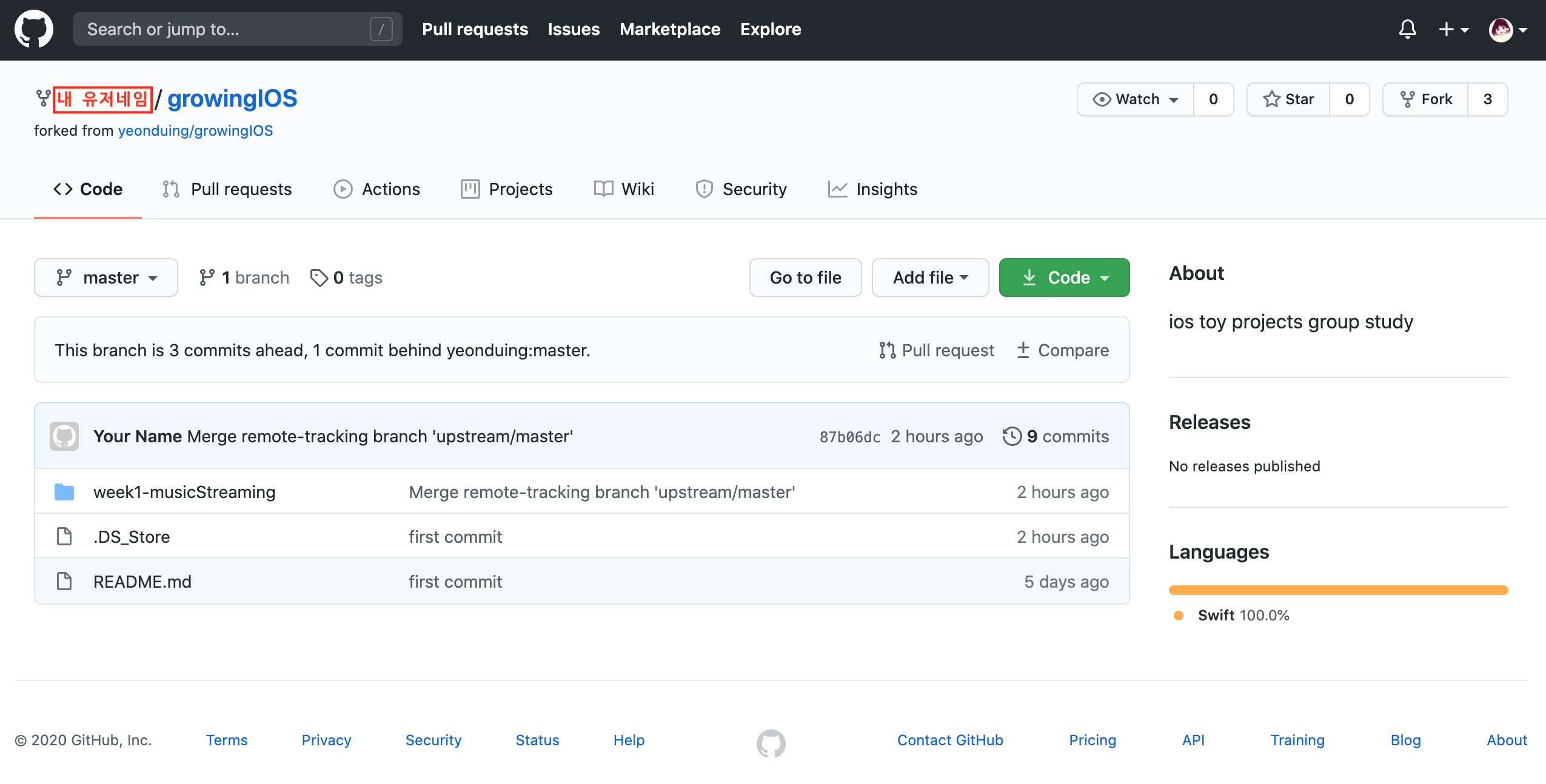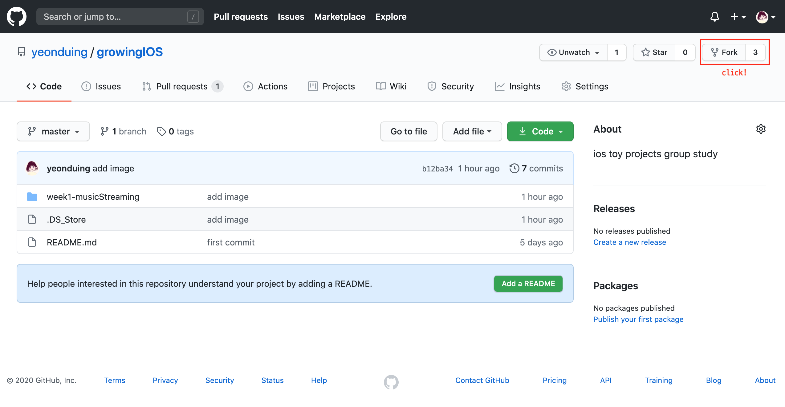 협업하고자 하는 git repository를 선택한 후 해당 repo를 fork한다. 우측 상단에 있는 fork 버튼을 누르면 자동으로 내 repository에 해당 repository가 생성된다.