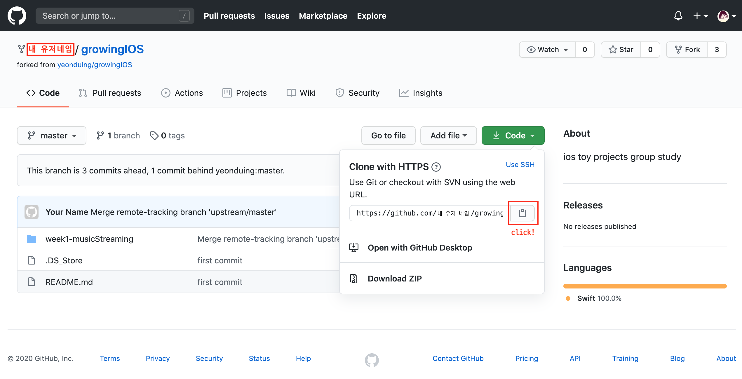 원래 클론했던 레퍼지토리에 가서 내 레퍼지토리를 클론한 것처럼 클론 버튼을 클릭 후 주소를 복사하여 remoteRepositoryPath 자리에 붙여넣기 한다.