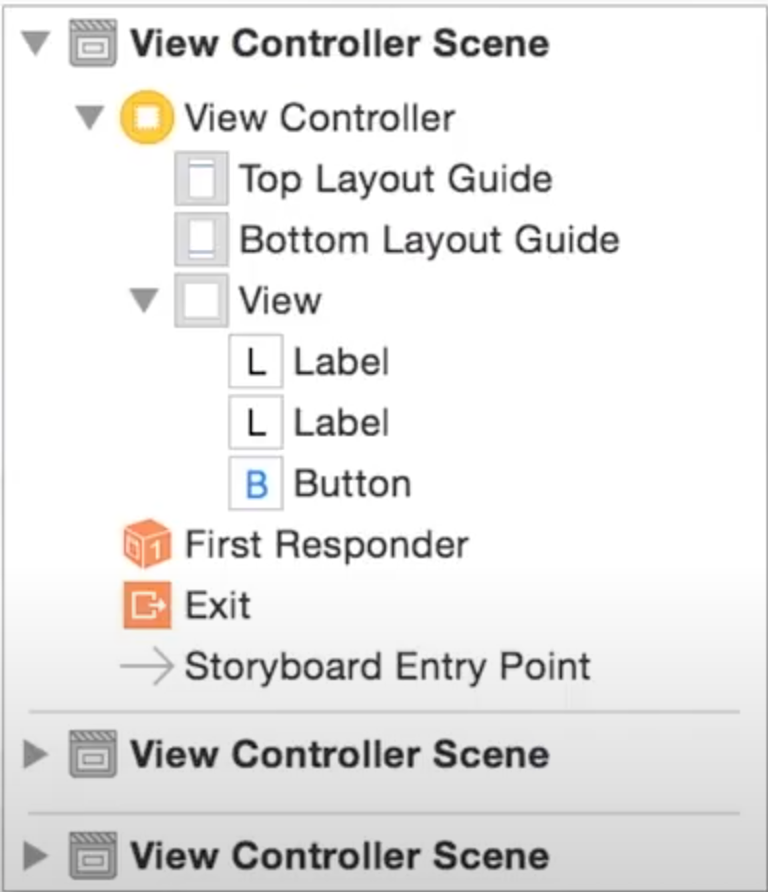 총 세 개의 씬으로 구성되어 있다. 각 씬을 펼쳐보면 씬을 구성하는 구성요소가 나타난다. 이 중 가장 중요한 것은 View Controller와 View 이다.