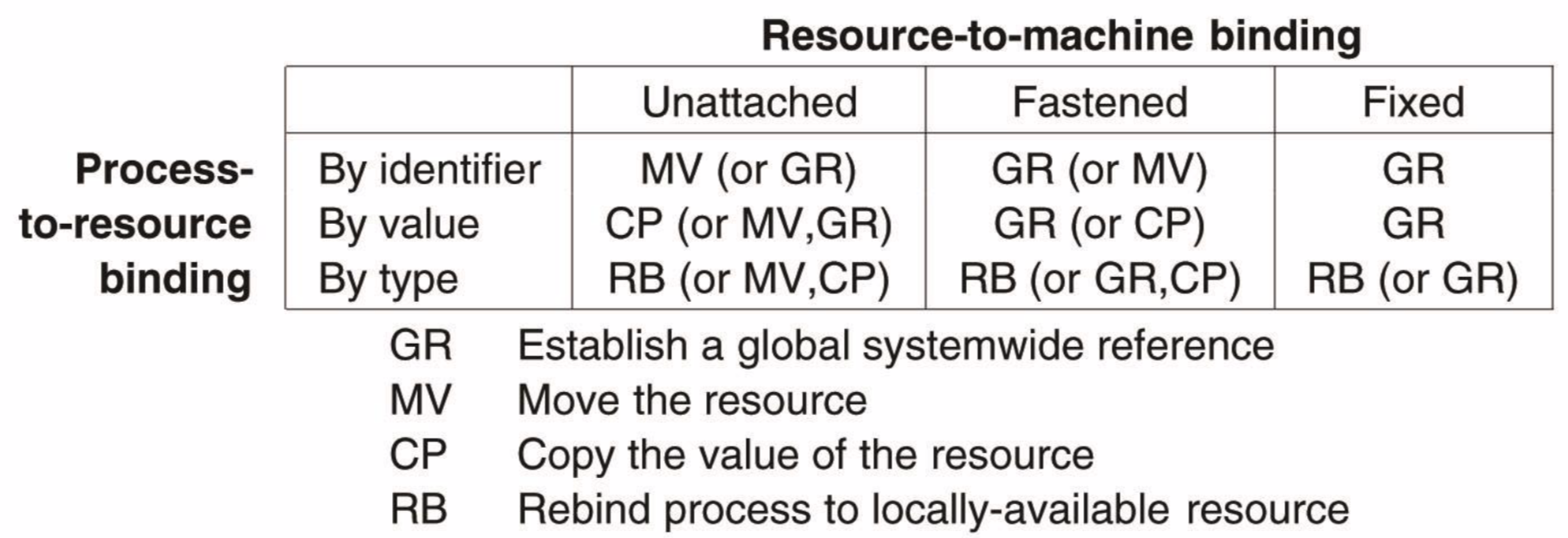 resources는 쉽게 이동시킬 수 없다. OS에 종속된 자원인 TCP 소켓의 경우 이동시켰을 때 의미가 없게 된다. 다른 예로 메모리 주소의 값을 이동시켜도 의미 없어진다. 이럴 경우 글로벌 링크를 만들어서 리소스는 이전 것에서 계속 사용하는 방법이 있다. 특정 파일에 대해 absolute URL을 만드는 것이 이런 경우이다. 또 다른 방법은 리소스 종류 중에 이전에 쓰던 리소스와 동일한 리소스가 새로 옮겨가는 것에 있다면 그쪽에 있는 리소스를 새로 쓰는 방법이 있다.