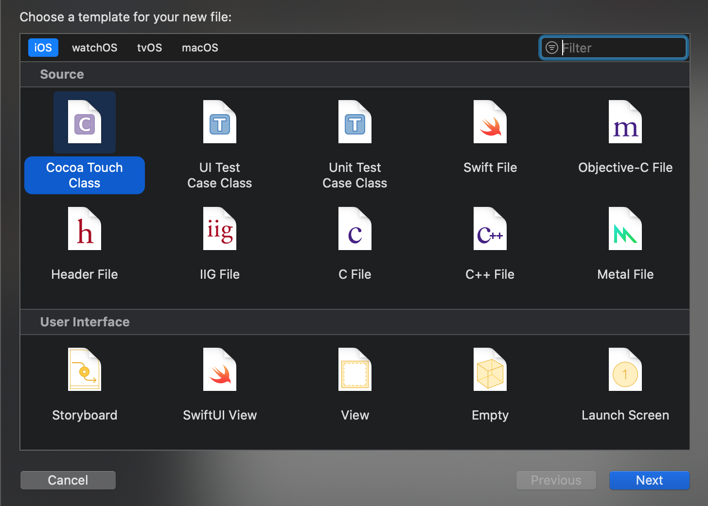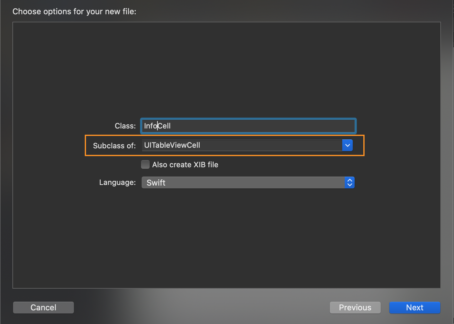 그다음 File-> New-> File...을 선택하여 스토리보드에 생성된 프로토타입 셀에 대한 뷰 파일을 생성한다.Cocoa Touch Class를 선택 후 subclass는 UITableViewCell을 선택한다. 기본적으로 생성한 셀은 커스텀이다.