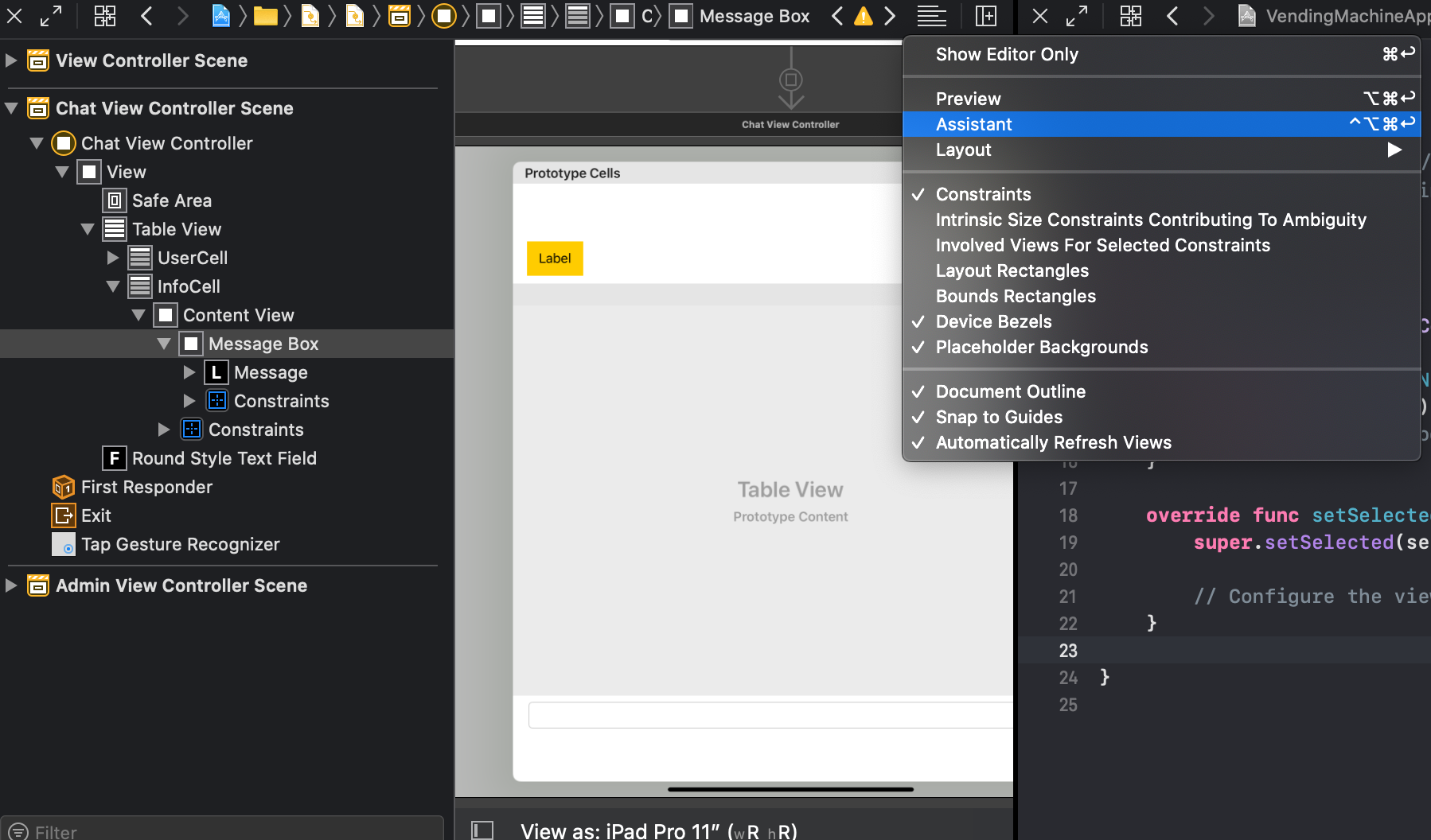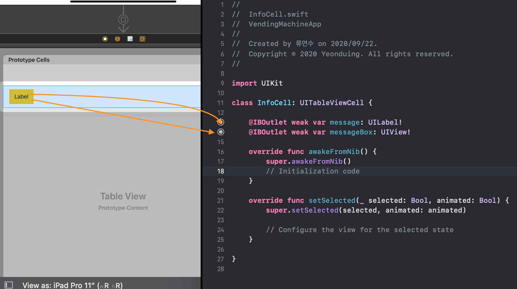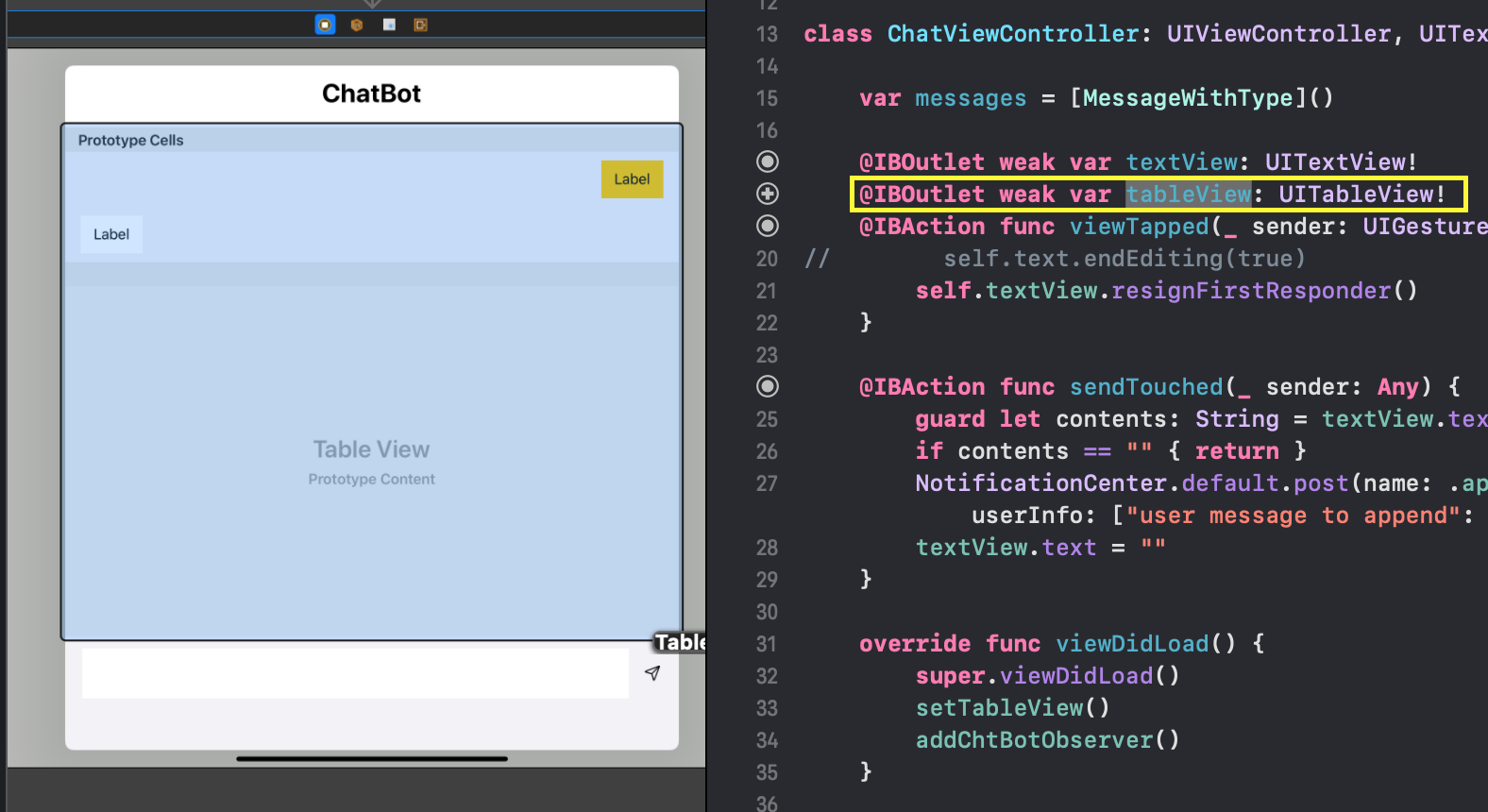 message에 해당하는 label과 messageBox에 해당하는 UIView를 위 이미지와 같이 스토리보드 상에 추가시키고 방금 생성한 UITableViewCell에 연결한다.