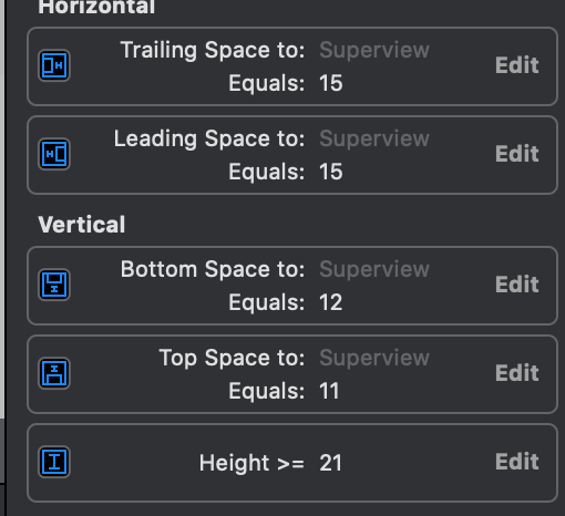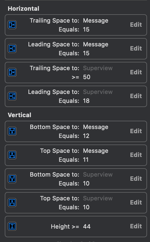 }메세지 박스의 경우 superView와 상하좌우 네 면 모두 오토 레이아웃이 걸려 있어야 한다. 메세지 박스와 메세지 라벨 모두 height가 유동적으로 변할 수 있도록 EqualTo 대신 GreaterOrEqualTo를 사용하도록 한다. 메세지 박스는 width 또한 일정하지 않으므로 superView와 trailing에 대해 유동적으로 바뀔 수 있도록 GreaterOrEqualTo를 적용한다.