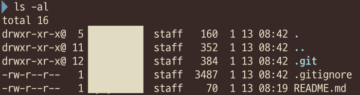앞서 복사해두었던 텍스트를 붙여넣고 저장한다. ls -al 명령어를 통해 확인해본 결과 .gitignore 파일이 잘 생성된 것을 알 수 있다.