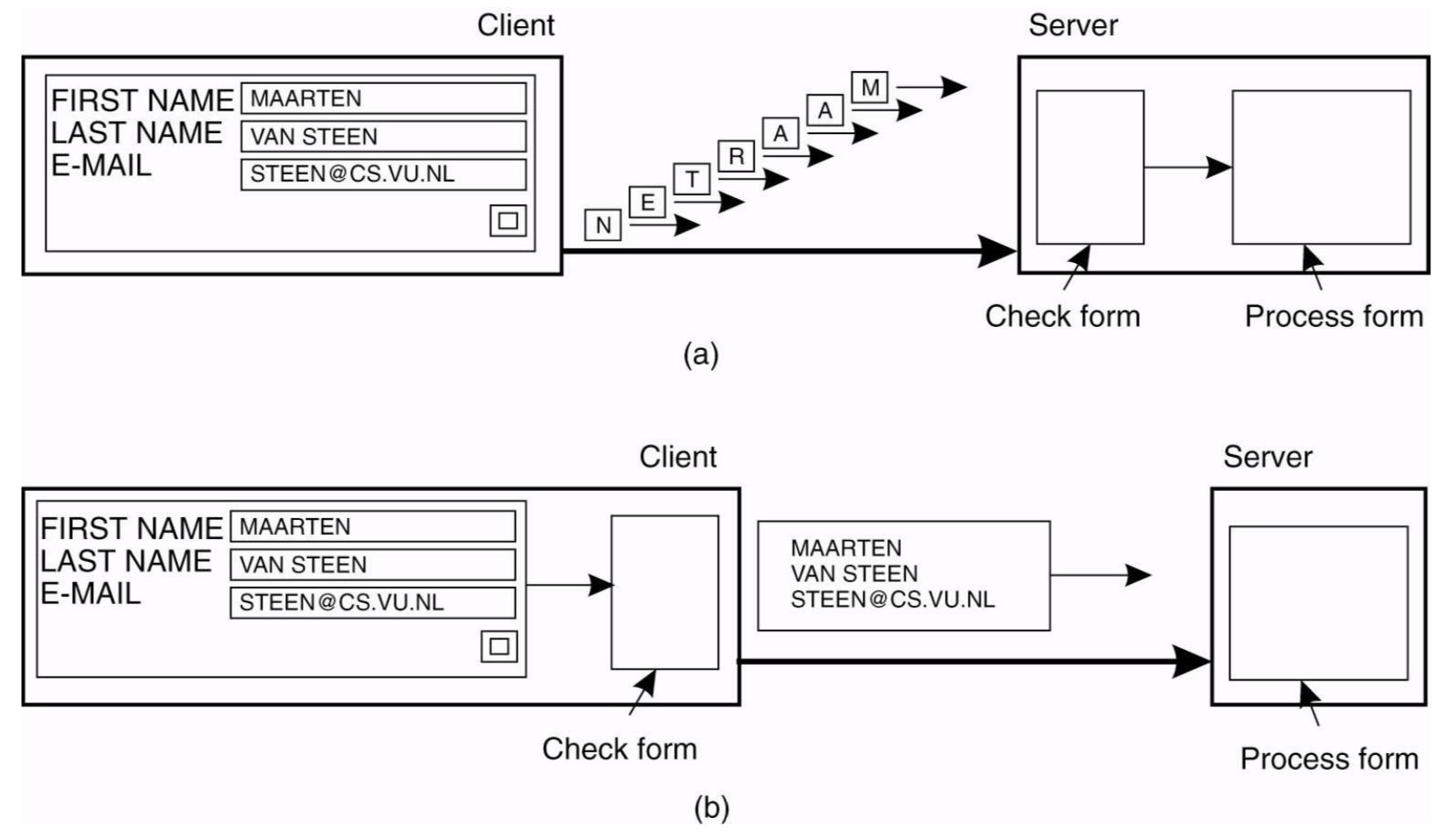 예를 들어 사용자가 입력한 폼의 적합성 형태를 서버에서 검증할 때 각 필드별로 서버에 요청한 후에 그 다음 필드를 검증받는다. 이 때 가능한 한 응답받는 횟수를 줄이기 위해 클라이언트에서 체크한 후에 한번에 데이터를 서버로 보낸다.